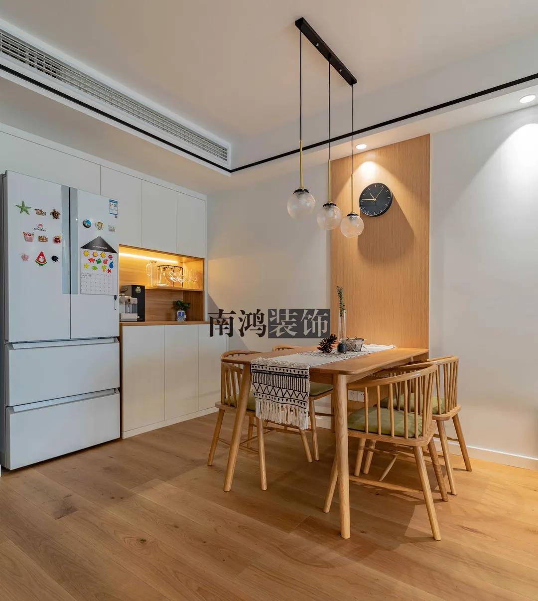 小戶型的餐廳比較適合做嵌入式餐邊柜,利用墻內(nèi)空間來做收納,能節(jié)約不少面積。