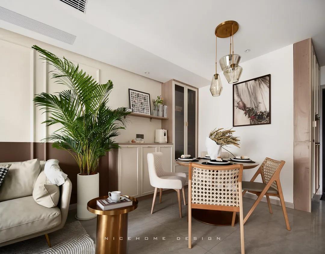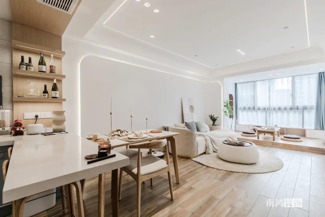 同理,客廳與餐廳都比較緊湊的話,不如就將二者做成一體式設計,功能放在同一個空間里,視野會因此變得開闊許多。