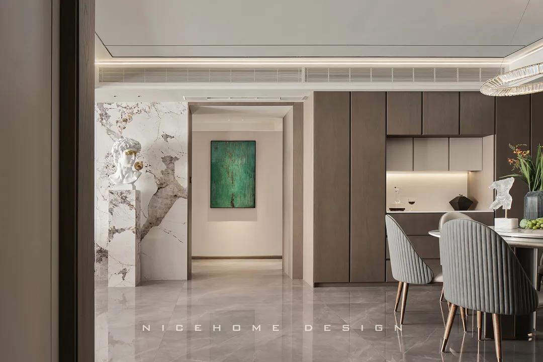 【項目·信息】 地址 | 盛世天城 城市 | 中國 寧波 戶型 | 四室兩廳 面積 | 185㎡ 風(fēng)格 | 現(xiàn)代輕奢 設(shè)計施工 | 浙江南鴻裝飾 主要用材 | 格萊美瓷磚、邁菲樂地板、杜拉維特衛(wèi)浴、洛華隆櫥柜、美萃家具、南鴻美家軟裝等 關(guān)于本案 About The Design 今天為大家?guī)硪惶赚F(xiàn)代輕奢風(fēng)格新作,男女主人均為小學(xué)老師,女兒十歲,常住人口為三名。他們希望家首先是要實(shí)用,有盡可能多的收納空間,其次有較高審美需求,在空間表現(xiàn)上希望溫馨舒適又不失藝術(shù)格調(diào)。 溫和與沉靜是這個家的主調(diào),開闊的空間擁有著優(yōu)越的采光與視野。穩(wěn)重的大地色配合大理石、金屬、皮革、棉麻等多種材質(zhì),極富力量和層次。 空間布局張弛有度,木飾面溫潤的色澤將暖意帶入其中,以“靜”為名的藝術(shù)妙筆記錄下生活的美好,打造一個生活美學(xué)與藝術(shù)氛圍相互平衡的居住領(lǐng)域。 關(guān)于戶型 About The House Type ▲原始結(jié)構(gòu)圖 ▲平面設(shè)計圖 01. 客廳 Living Room 客廳是一個采光良好的方正大空間,明朗、大氣,穩(wěn)重的大地色烘托溫和而親切的人文氣質(zhì)。 頂面黑色不銹鋼和磁吸軌道燈形成線條延伸感,增加了視覺層次。沙發(fā)背景植入小法式護(hù)墻混搭,與大衛(wèi)雕塑組合,為空間注入靈動與格調(diào)。自過道口頂端特意拉出一道折線燈帶,勾勒個性的藝術(shù)氣場。 壁掛電視與收納背景合而為一,外觀利落整潔。儲物柜精準(zhǔn)分配開閉比例,收放自如之間,穩(wěn)妥了實(shí)用機(jī)能,協(xié)調(diào)了日常節(jié)奏,讓設(shè)計感恰到好處。 空間平鋪的溫厚色澤以穩(wěn)重低調(diào)的問候與居者發(fā)生情感碰撞,含蓄內(nèi)斂兼具東方美學(xué)韻味,一呼一吸之間將溫度與關(guān)懷深入人心。 陽臺處設(shè)計品茶區(qū),清冽的茶香伴著溫煦日光,縈繞此間的只有言笑晏晏的自在感受... 02. 餐廳 Dining Room 餐廳與客廳以過道為界,餐桌椅均線條簡練卻不乏精致細(xì)節(jié),一側(cè)大體量餐邊柜用于收納諸多雜物,空出的操作臺日后可擺放一些小家電,方便制作簡餐。 03. 廚房 Kitchen 廚房櫥柜選擇與公區(qū)域同種溫和色系,搭配灰色墻地磚,視覺得到統(tǒng)一,空間更顯明亮潔凈。 04. 過道 Corridor 過道懸一幅尺寸適中的掛畫,詩意的綠色剛好與背景墻大理石肆意灑脫的紋理相映成趣,賦予空間別樣的張力。 05. 臥室 Bedroom 主臥之內(nèi)所流動的情感,溫暖而真誠。藝術(shù)感與生活感交融,營造出親切而閑適的氛圍,分分鐘便能撫平主人一天的疲憊。 床尾斗柜延伸出梳妝臺區(qū)域,綠植、畫作、小雕塑,共同圍構(gòu)出一角小小的藝術(shù)天地。 客臥的氣質(zhì)同樣雅致非凡,光線流連入內(nèi),盈盈散發(fā)著溫潤平靜的質(zhì)感。右上角的個性掛飾就像是懸浮在半空中的月亮,讓夜晚充滿浪漫的情調(diào)。 06. 兒童房 Children's Room 以馬卡龍粉為主色調(diào)的女兒房,睡眠區(qū)、學(xué)習(xí)區(qū)、休閑區(qū)、收納區(qū)被有序安置,保障孩子能夠擁有一個完善的成長環(huán)境。房間內(nèi)也有許多孩子喜愛的童趣元素,看,墻上這只頭戴小花的兔兔是不是就特別地可愛呢~ 自然親膚的面料給予孩子最大的舒適感受。 07. 書房 Study 書房,沒有任何多余的裝飾,書桌椅+大書柜的配置便已足夠日常的辦公、學(xué)習(xí)使用,轉(zhuǎn)角飄窗也被妥善利用起來,作為閑適一角。 08. 衛(wèi)生間 Toilet 衛(wèi)浴干濕分離,懸空式設(shè)計的原木儲物柜與臺盆柜足以滿足收納之需,視覺上也更加輕盈不添負(fù)擔(dān),保留一份簡單純粹。